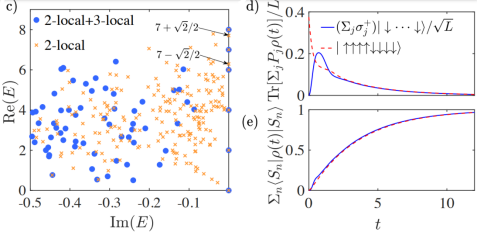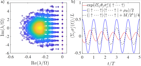 Figure 2:Numerical results for the Liouvillian spectrum and dissipative scarred dynamics