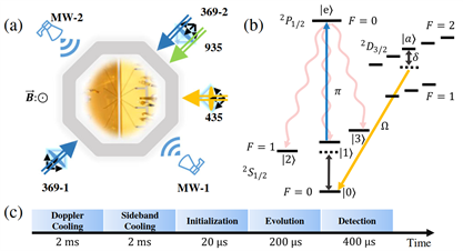 Professor Luming Duan’s research group has experimentally realized a non-Hermitian model, which hosts knotted complex energies, using a single 171Yb+ ion in a Paul trap. The Hermitian part of the system is realized by microwave pulses driving the transition between the ground state hyperfine levels (MW-1 and MW-2 in Fig. 1a, represented by a black double arrow in Fig.1b), and the non-Hermitian part is achieved by resonant lasers driving the ions from the ground state to the excited state (369-1 and 369-2 in Fig. 1a, represented by the blue arrow in Fig. 1b), leading to population loss of an ion via spontaneous radiation (wavy lines in Fig. 1b). In order to measure the complex eigenenergy of the system, the ion is initially prepared on the 2D3/2 level (auxiliary level) and coupled to the system level using a weak laser (435 in Fig. 1a, represented by the yellow arrow in Fig. 1b). After a long time, the probability of the ion being on the auxiliary level was measured. By fitting the measured probability with respect to the detuning, the complex energy of the non-Hermitian system can be extracted. The experimentally measured complex energies exhibit the unlink, unknot, and Hopf link topological structures (Fig. 2 and Fig. 3), which agree well with theoretical values. This method can also be directly generalized to other quantum simulation platforms such as cold atoms, superconducting circuits, or solid-state spin systems; thus, the experiment opens an avenue for exploring various complex-energy properties in non-Hermitian quantum systems.