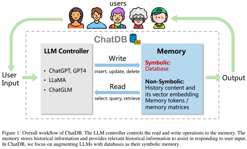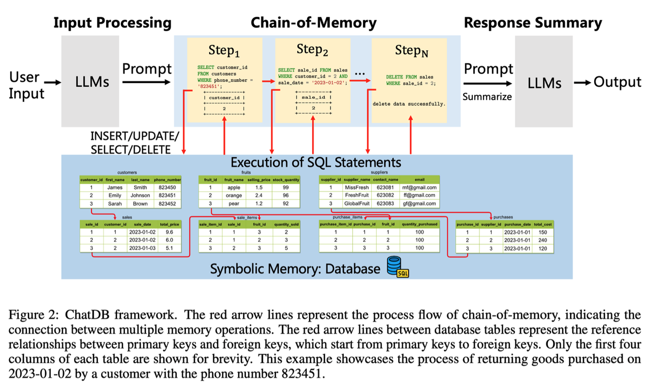 This research has made several contributions to the field of LLMs: firstly, it augments LLMs with databases as external symbolic memory, allowing for structured storage of historical data and enabling symbolic and complex data operations using SQL statements. In addition, the proposed “chain-of-memory” approach enables effective memory manipulation by converting user input into multi-step intermediate memory operations, which empowers ChatDB to handle complex, multi-table database interactions with higher accuracy and stability. At last, the experiments demonstrate that augmenting LLMs with symbolic memory improves multi-hop reasoning capabilities and prevents error accumulation, thereby enabling ChatDB to outperform ChatGPT on a synthetic datasets.