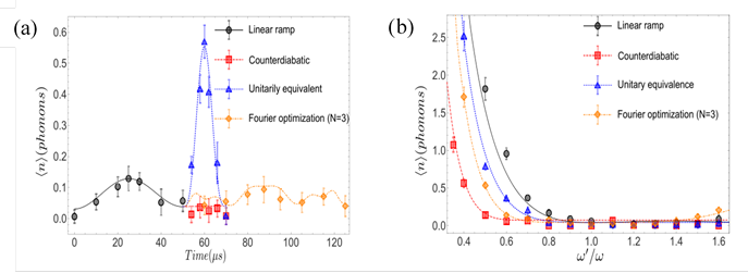 Figure 2:Experiment results. (a) The nonadiabatic excitation in the instantaneous basis of different shortcut methods. Only the counterdiabatic driving realizes the adiabatic following all the time. (b) Robustness tests. We assume the trap frequency drifts to a wrong value and measure the final excitation of different shortcuts designed with the original value. The result shows the counterdiabatic driving is the best result.