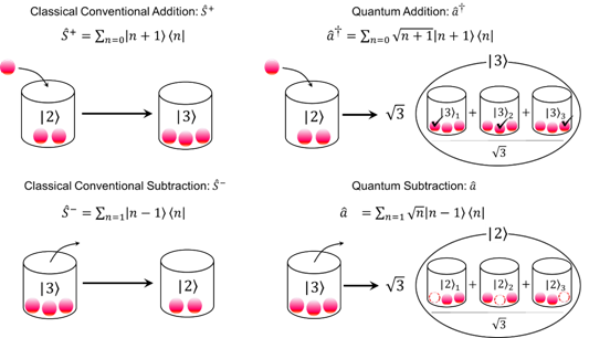Figure 1 The fundamental difference between classical and quantum arithmetic. In the classical arithmetic, we deterministically add or subtract a particle, but in quantum mechanics, the probability of adding and subtracting a particle depends on how many are already there, which makes the operation probabilistic.