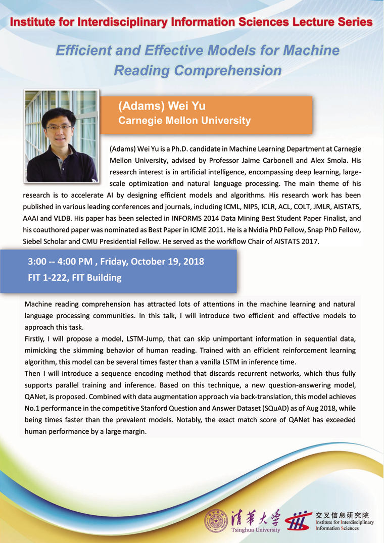 (Adams) Wei Yu is a Ph.D. candidate in Machine Learning Department at Carnegie Mellon University, advised by Professor Jaime Carbonell and Alex Smola. His research interest is in artificial intelligence, encompassing deep learning, large-scale optimization and natural language processing. The main theme of his research is to accelerate AI by designing efficient models and algorithms. His research work has been published in various leading conferences and journals, including ICML, NIPS, ICLR, ACL, COLT, JMLR, AISTATS, AAAI and VLDB. His paper has been selected in INFORMS 2014 Data Mining Best Student Paper Finalist, and his coauthored paper was nominated as Best Paper in ICME 2011. He is a Nvidia PhD Fellow, Snap PhD Fellow, Siebel Scholar and CMU Presidential Fellow. He served as the workflow Chair of AISTATS 2017.