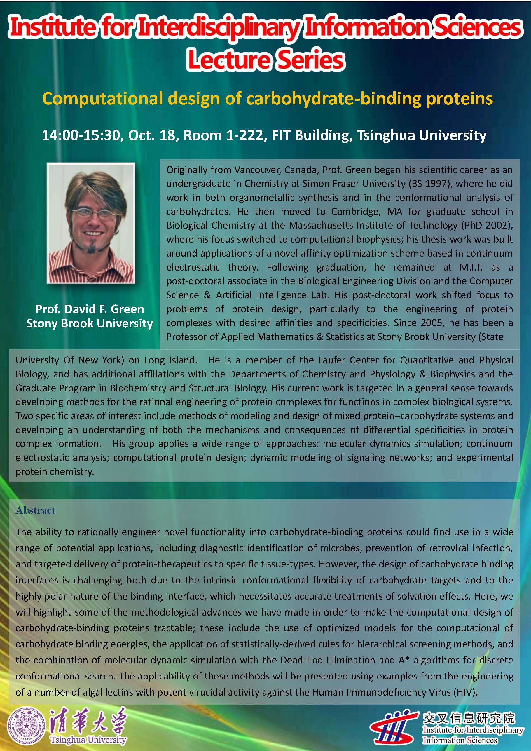 Originally from Vancouver, Canada, Prof. Green began his scientific career as an undergraduate in Chemistry at Simon Fraser University (BS 1997), where he did work in both organometallic synthesis and in the conformational analysis of carbohydrates. He then moved to Cambridge, MA for graduate school in Biological Chemistry at the Massachusetts Institute of Technology (PhD 2002), where his focus switched to computational biophysics; his thesis work was built around applications of a novel affinity optimization scheme based in continuum electrostatic theory. Following graduation, he remained at M.I.T. as a post-doctoral associate in the Biological Engineering Division and the Computer Science & Artificial Intelligence Lab. His post-doctoral work shifted focus to problems of protein design, particularly to the engineering of protein complexes with desired affinities and specificities. Since 2005, he has been a Professor of Applied Mathematics & Statistics at Stony Brook University (State University of New York) on Long Island. He is a member of the Laufer Center for Quantitative and Physical Biology, and has additional affiliations with the Departments of Chemistry and Physiology & Biophysics and the Graduate Program in Biochemistry and Structural Biology. His current work is targeted in a general sense towards developing methods for the rational engineering of protein complexes for functions in complex biological systems. Two specific areas of interest include methods of modeling and design of mixed protein–carbohydrate systems and developing an understanding of both the mechanisms and consequences of differential specificities in protein complex formation. His group applies a wide range of approaches: molecular dynamics simulation; continuum electrostatic analysis; computational protein design; dynamic modeling of signaling networks; and experimental protein chemistry.