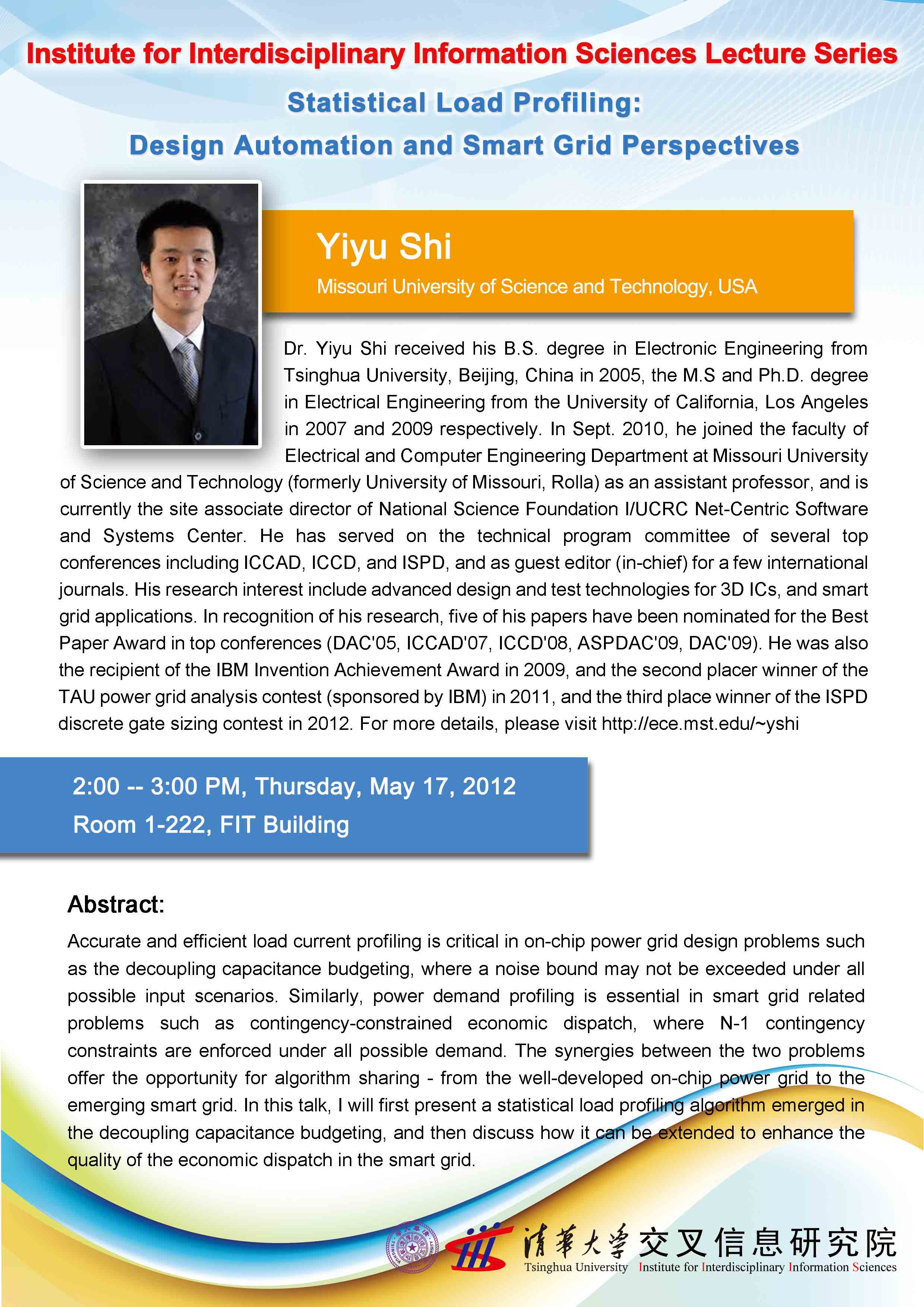 Dr. Yiyu Shi received his B.S. degree in Electronic Engineering from Tsinghua University, Beijing, China in 2005, the M.S and Ph.D. degree in Electrical Engineering from the University of California, Los Angeles in 2007 and 2009 respectively. In Sept. 2010, he joined the faculty of Electrical and Computer Engineering Department at Missouri University of Science and Technology (formerly University of Missouri, Rolla) as an assistant professor, and is currently the site associate director of National Science Foundation I/UCRC Net-Centric Software and Systems Center. He has served on the technical program committee of several top conferences including ICCAD, ICCD, and ISPD, and as guest editor (in-chief) for a few international journals. His research interest include advanced design and test technologies for 3D ICs, and smart grid applications. In recognition of his research, five of his papers have been nominated for the Best Paper Award in top conferences (DAC'05, ICCAD'07, ICCD'08, ASPDAC'09, DAC'09). He was also the recipient of the IBM Invention Achievement Award in 2009, and the second placer winner of the TAU power grid analysis contest (sponsored by IBM) in 2011, and the third place winner of the ISPD discrete gate sizing contest in 2012. For more details, please visit http://ece.mst.edu/~yshi