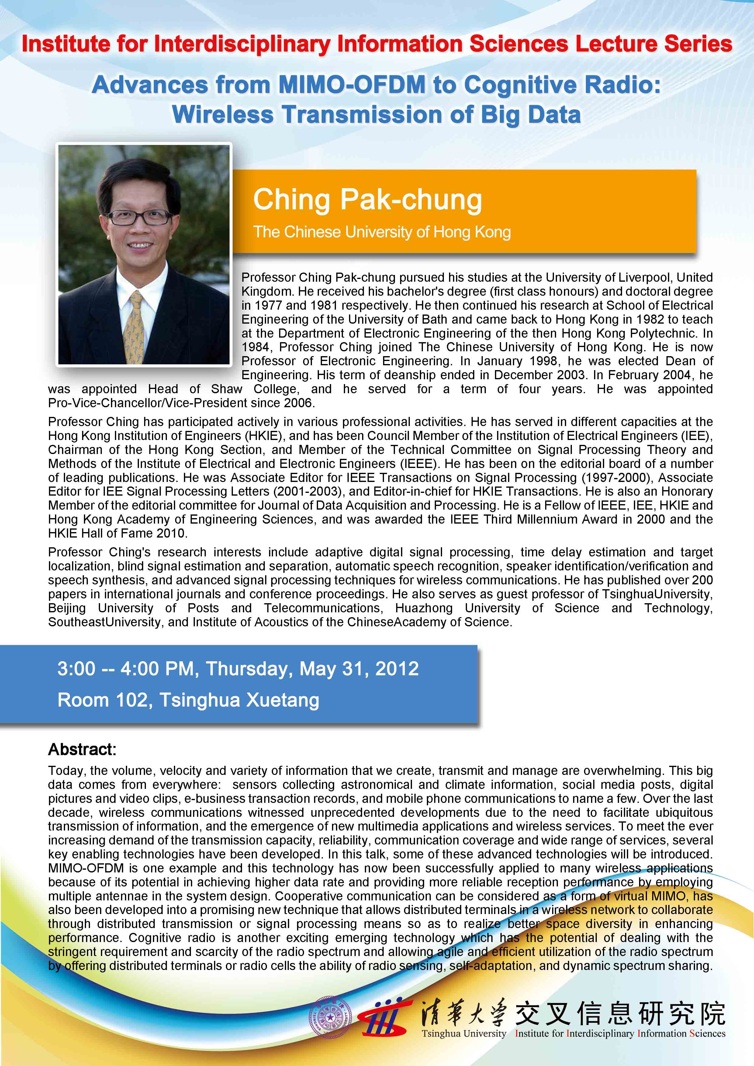 Professor Ching's research interests include adaptive digital signal processing, time delay estimation and target localization, blind signal estimation and separation, automatic speech recognition, speaker identification/verification and speech synthesis, and advanced signal processing techniques for wireless communications. He has published over 200 papers in international journals and conference proceedings. He also serves as guest professor of TsinghuaUniversity, Beijing University of Posts and Telecommunications, Huazhong University of Science and Technology, SoutheastUniversity, and Institute of Acoustics of the ChineseAcademy of Science.