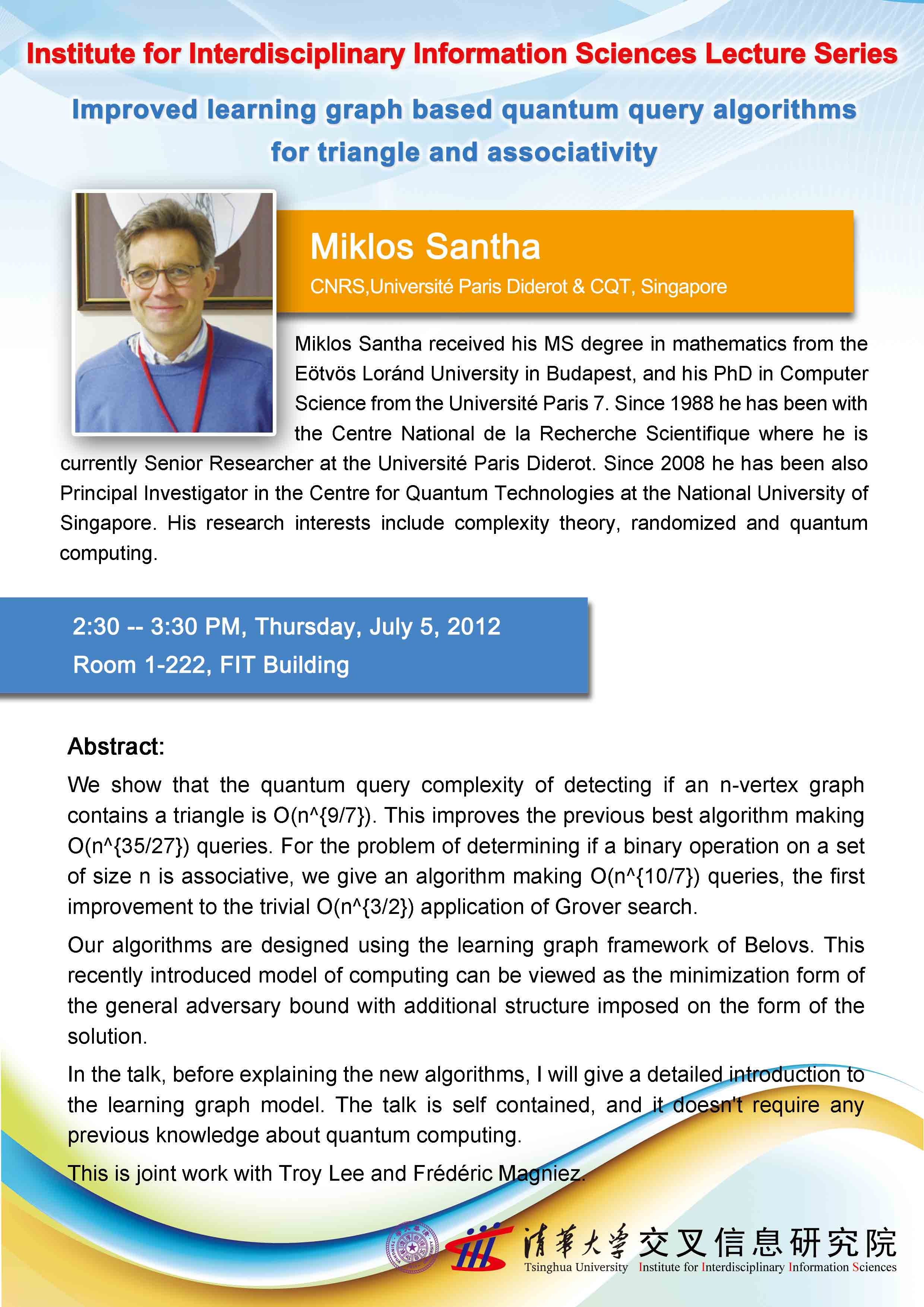 Miklos Santha received his MS degree in mathematics from the Eötvös Loránd University in Budapest, and his PhD in Computer Science from the Université Paris 7. Since 1988 he has been with the Centre National de la Recherche Scientifique where he is currently Senior Researcher at the Université Paris Diderot. Since 2008 he has been also Principal Investigator in the Centre for Quantum Technologies at the National University of Singapore. His research interests include complexity theory, randomized and quantum computing.