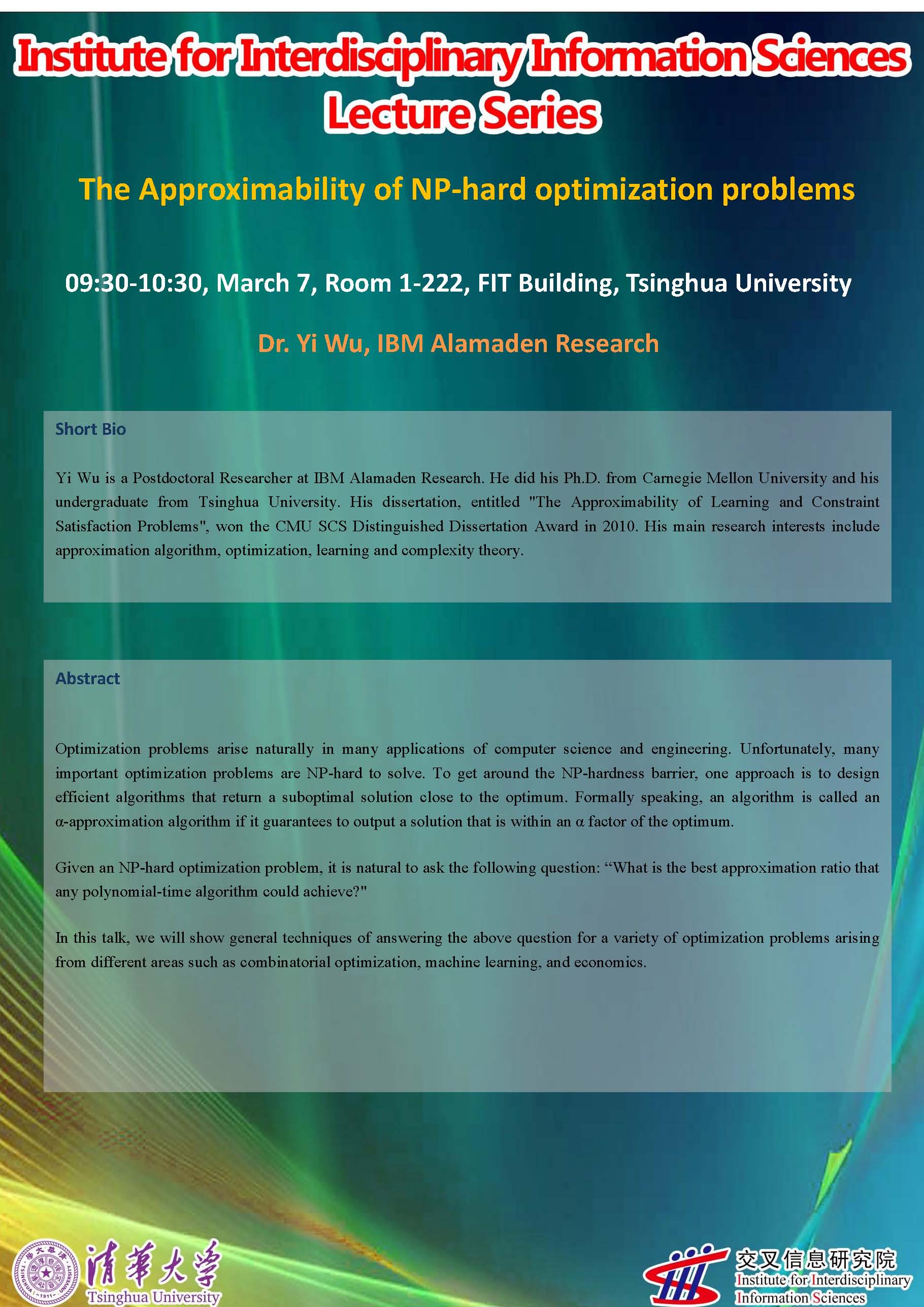 Yi Wu is a Postdoctoral Researcher at IBM Alamaden Research. He did his Ph.D. from Carnegie Mellon University and his undergraduate from Tsinghua University. His dissertation, entitled "The Approximability of Learning and Constraint Satisfaction Problems", won the CMU SCS Distinguished Dissertation Award in 2010. His main research interests include approximation algorithm, optimization, learning and complexity theory.