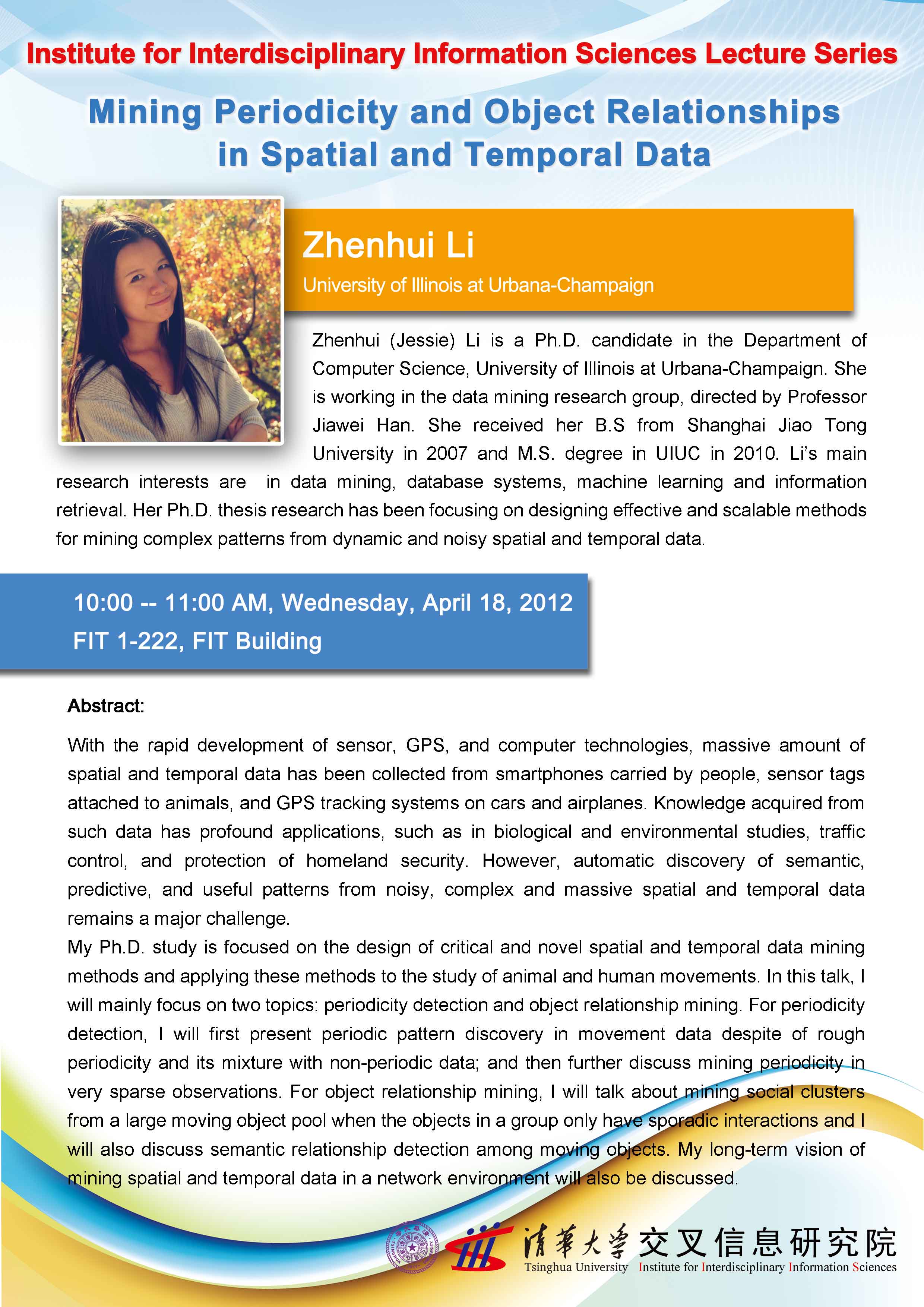 Zhenhui (Jessie) Li is a Ph.D. candidate in the Department of Computer Science, University of Illinois at Urbana-Champaign. She is working in the data mining research group, directed by Professor Jiawei Han. She received her B.S from Shanghai Jiao Tong University in 2007 and M.S. degree in UIUC in 2010. Li’s main research interests are in data mining, database systems, machine learning and information retrieval. Her Ph.D. thesis research has been focusing on designing effective and scalable methods for mining complex patterns from dynamic and noisy spatial and temporal data.