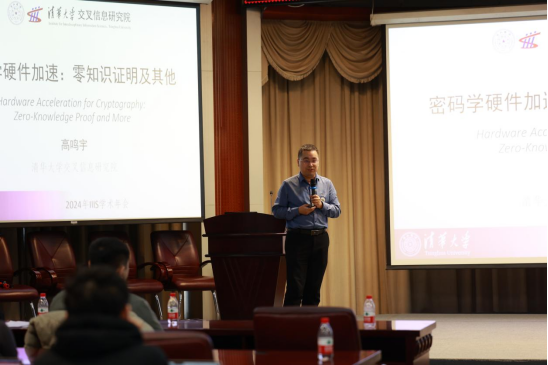 交叉信息院助理教授高鸣宇以“密码学硬件加速:零知识证明和其它”为题,介绍了零知识证明的概念及其在区块链、云计算等场景的应用。并基于零知识证明硬件加速器,展示了研究组的相关工作。问答环节,师生就零知识证明与全同态加密的相对优势等话题进行了交流探讨。