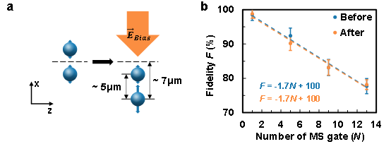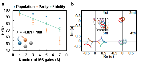 为实现全连通的量子纠缠逻辑门,研究人员设计了交替寻址两个目标离子的量子纠缠逻辑门方案,以克服杂散光斑造成的串扰误差,并将其应用于斜向离子对,得到了96%的保真度。为了进一步将该方案扩展至更大规模的二维离子阵列,研究人员分析了离子微运动对于逻辑门的影响,实验验证了其效应可通过对寻址光功率的重新校准来进行补偿。该工作为基于二维离子阵列的大规模通用量子计算方案铺平了道路。