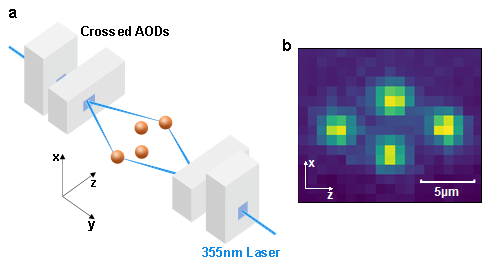 图 1 基于声光偏转器的二维寻址方案和实验所用四离子二维阵列图像。