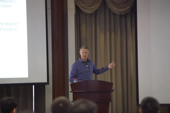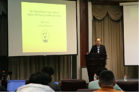 随后,Thorup教授在讲座中向交叉信息院师生展示了哈希函数的重要进展,讲解了切尔诺夫界(Chernoff bound)、稀疏约翰逊-林登斯特劳斯变换(Johnson—Lindenstrauss)等理论背后的原理,并讨论了从理论跨越到高效实践之间的路径。