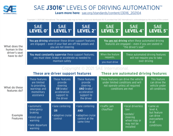 图|国际自动机工程师学会(Society of Autonomous Engineers,SAE)将自动驾驶分为六个等级,其中Level 0至Level 2属于辅助驾驶阶段,而Level 3至Level 5属于自动驾驶阶段。