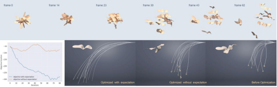 借助AI优化人造翅果空气动力学性能可以抽象为一个寻找优化目标函数最优解的过程,然而,由于流体自身的混沌性,通过流体仿真计算得到的目标函数能量景观(energy landscape)极不光滑,包含大量局部最优解,优化难度很大。乐齐钦介绍了论文中为了解决这个问题对目标函数进行的两种平滑处理:“第一,我们借鉴了强化学习中利用概率分布描述系统初始状态的理念,来描述翅果的初始位姿并将目标函数的期望作为优化对象,更好地刻画了真实翅果从植物上脱落时位姿的随机性。第二,我们借鉴图形学领域最新的优化方案训练了一个神经网络模型,局部拟合了翅果的形态空间到目标函数空间的映射。我们观察到拟合后神经网络的能量景观保留了目标函数的变化趋势,但更加平滑,是很好的优化对象。”