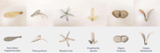 研究组首先构建了一个翅果种子数据集。论文合作者、交叉信息研究院2021级本科生卜佳木回忆说:“我们在收集高质量翅果时费了不少功夫。网店上的种子通常以播种为目的,绝大部分的形态都不完整导致无法进行研究。后来,我们了解到云南西双版纳翅果资源较为丰富,在网上联系到一些当地供货商买到了需要的翅果样本。”随后,研究组利用清华大学基础工业训练中心提供的手持式三维扫描仪对每一颗翅果进行了三维数字重建,经过处理后形成了包含55枚种子三维样本的数据集。这些种子横跨14个物种,保证形态的多样性。