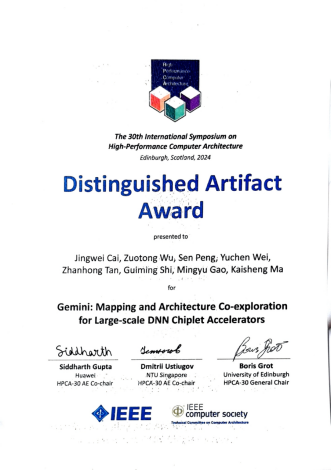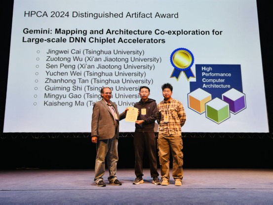 2024年3月,计算机体系结构顶级会议HPCA2024在英国爱丁堡举办,清华大学交叉信息院马恺声研究组与高鸣宇研究组联合发表的科研成果Gemini: Mapping and Architecture Co-exploration for Large-scale DNN Chiplet Accelerators荣获会议Distinguished Artifact Award。