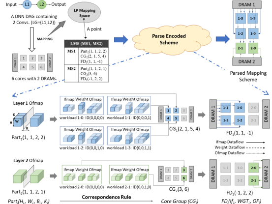 该成果主要研究了在深度学习芯粒加速器领域如何用映射和架构联合探索的手段进行优化的问题。文章首先提出了一套以层为中心的描述方式来对层间空间映射方案进行描述,并进而定义整体优化空间。其次,文章提出一个软硬件联合探索的优化框架GEMINI来对深度学习加速器架构和映射进行联合优化。最后,文章进行大量实验,较最先进方案,实现了1.98倍性能提升和1.41倍的能效提升,仅多消耗14.3%的货币成本。同时该文章得到的大量重要结论对chiplet架构和mapping策略设计有重要启发意义。