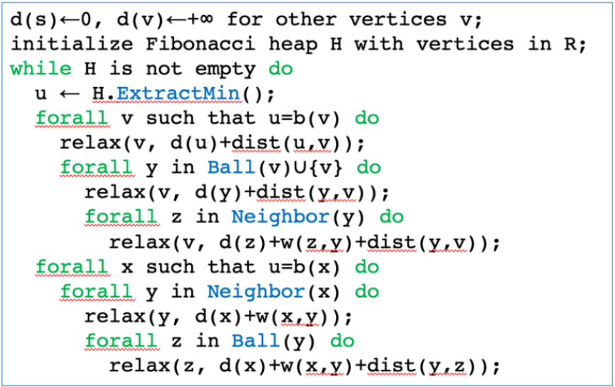 Dijkstra算法每次从优先级队列(斐波那契堆)中取出目前距离最短的点,然后扫描这个点的边;而新的算法只随机取一部分点放到斐波那契堆中(称为点集R),而其他点v都绑定到离它最近的R点(称为b(v)),并且找到距离v比b(v)更近的所有点,称为Ball(v)。如果R的大小为n/k,则Ball(v)的平均大小为O(k)。(这里m为图的边数、n为点数)