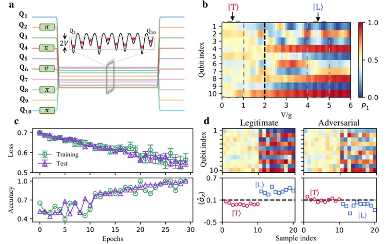 在量子机器学习领域,近年来的理论工作展示了在某些特定的任务下,量子分类模型和生成模型相对于经典模型具有可证明的、有复杂性理论保证的优势。最近两年,量子对抗机器学习的概念也被提出并受到了广泛关注。然而,在当前中等规模带噪声(NISQ)量子设备上演示量子学习模型面对对抗攻击的脆弱性和防御手段还面临诸多挑战。在本次的工作中,清华大学交叉信息研究院邓东灵研究组设计了处理经典数据和量子多体态数据的学习模型,并与浙江大学超导量子计算团队合作,首次在量子设备上成功实现了高维数据的学习、对抗攻击脆弱性的揭示、以及相应防御手段的展示。