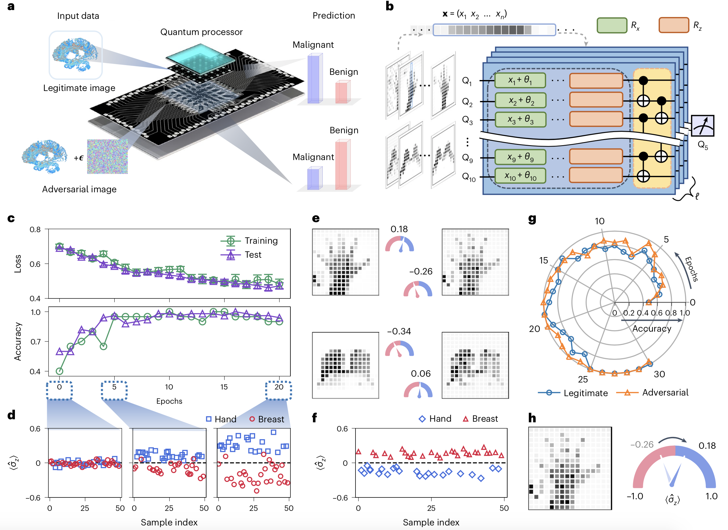实验首先进行的是高维经典数据的对抗学习,并采用了核磁共振图像(MRI)作为训练数据。为了在当前存在噪声的超导量子芯片上实现较高的分类精度,实验采用了变分参数和输入数据交错嵌入的方案。在训练至收敛并达到较好的效果后,实验通过生成对抗噪声的方式,发现这个量子分类模型面对添加了对抗噪声的样本会给出错误的分类判断,揭示了当前模型面对对抗攻击的脆弱性。为了增强模型面对潜在对抗噪声的鲁棒性,实验采用对抗训练的方式对模型进行了重新训练。相应的结果显示,在对抗训练后,之前导致模型给出错误判断的对抗样本不能使更新后的模型再次出错,对抗训练的防御效果得到了验证。