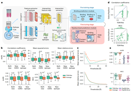 图1. TEIM模型结构和评估效果 (a) TEIM-Seq 和 TEIM-Res 的模型结构以及训练流程。 除了最后一个模块外,TEIM-Seq 和 TEIM-Res 模型共享相似的架构。 它们都有特征提取器来分别学习 CDR3 和抗原表位的序列特征,然后将它们扩展到不同的维度以形成交互特征图。 接下来,主要由二维卷积神经网络(2D CNN)组成的交互提取器用于提取成对残基交互信息。 此外,由自动编码器生成的表位特征向量被馈送到交互提取器中以获取全局表位信息。 最后,TEIM-Seq 使用结合预测模块聚合所有成对交互来预测结合得分(即结合概率),而 TEIM-Res 使用由 2D CNN 层组成的残基级预测模块来预测距离矩阵和接触矩阵。 训练流程包括两个阶段:首先在序列级结合数据上预训练 TEIM-Seq,然后在残基粒度的结合数据上微调 TEIM-Res。 (b) TEIM-Res 和其它基线方法相比,在三种不同数据划分设置下的性能表现。(c) TEIM-Res 和平均基线的不同距离阈值内残基对的均方/相对误差。 (d) GalaxyPepDock 和 TEIM-Res 之间的性能比较。 (e) TEIM-Res、平均基线和 PepNN 在预测结合矩阵任务上的性能比较。