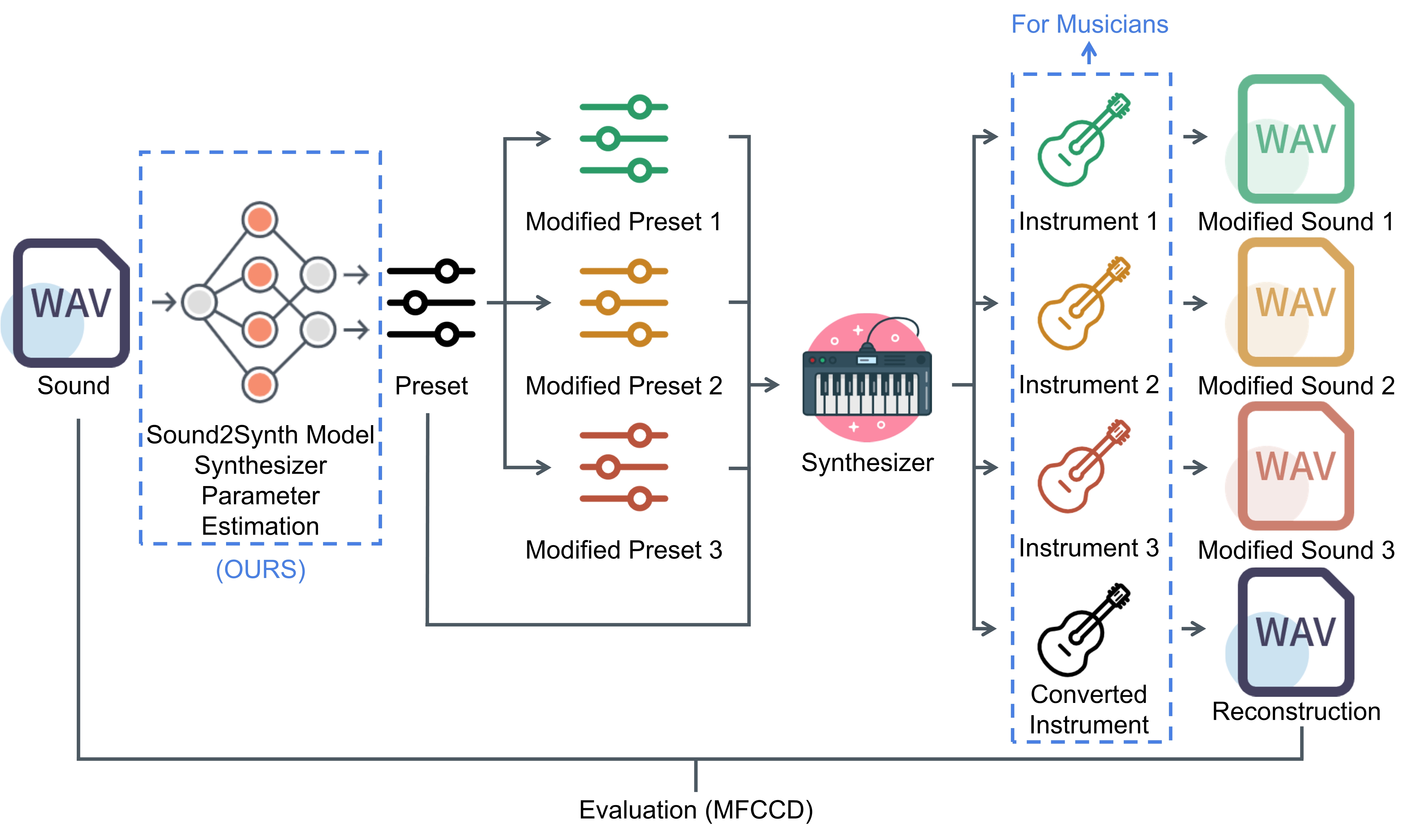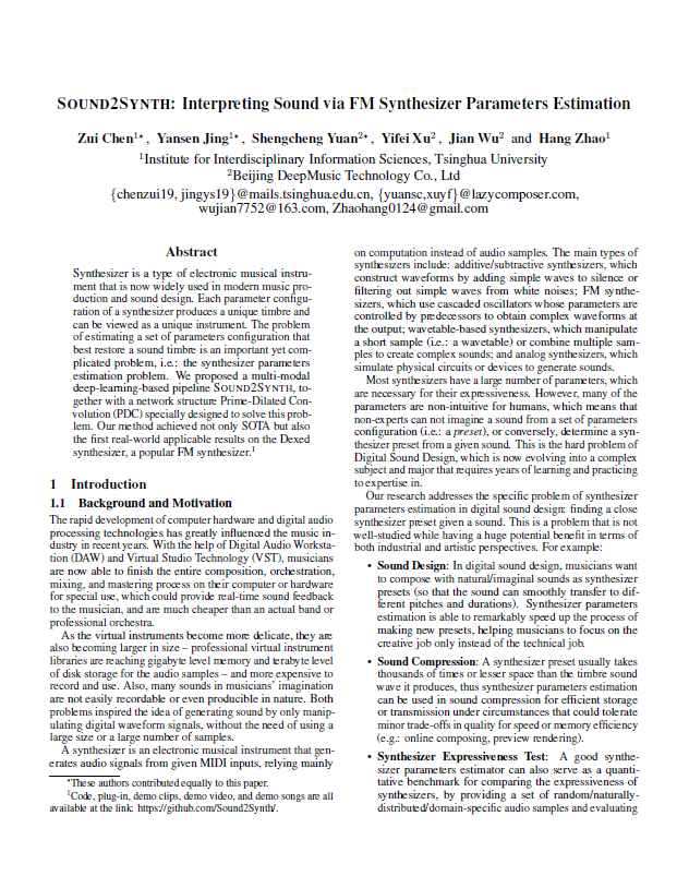 想要将鸟叫声做成一首音乐?想要为一部科幻电影配乐?想要定制一把异域风情的吉他?你需要一个合成器。合成器是一种通过算法生成音频波形的电子乐器:每次传入一组不同的参数,就会得到一个不同的乐器。然而,究竟哪几组参数对应鸟叫声、科幻音效、吉他呢?为合成器找到合适的参数是一个复杂的课题——电子音色设计,而这往往需要音乐工作者经过数年学习积累、熟练使用合成器。Sound2Synth旨在使用神经网络将一段音频自动转化为合成器参数,进而得到比原音频更加灵活可调节的乐器,可以显著简化音乐工作者的工作流程。除此之外,合成器参数估计问题在现代音乐工业中也有其他十分重要的应用,例如音频压缩、合成器评估等。