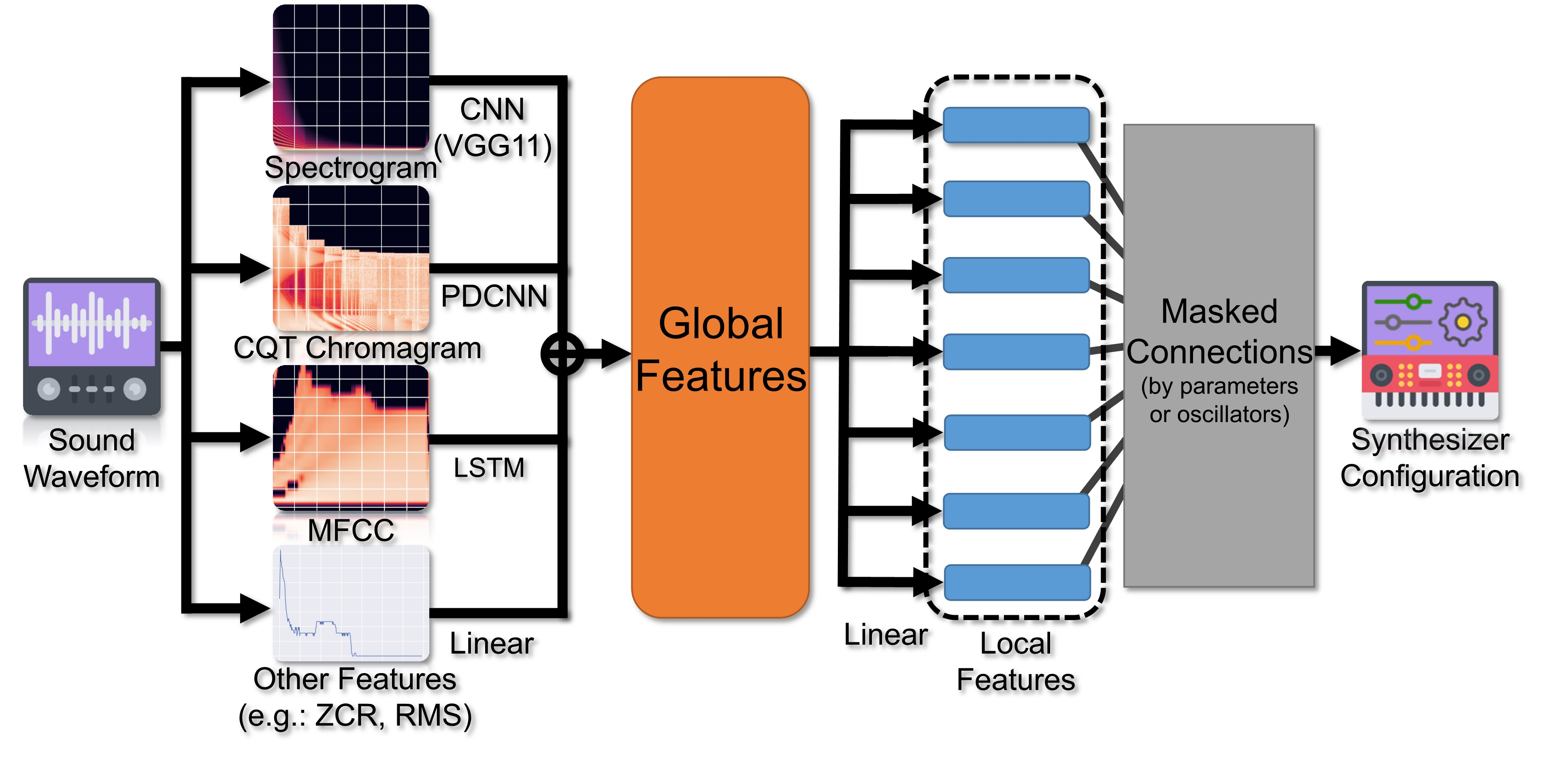 流程方面,景彦森和陈醉同学使用监督学习方法,将合成器参数估计问题转化为多标签分类问题进行训练。合成器参数十分庞大复杂 (例如Dexed合成器有155个参数,包括连续和离散参数),他们提出了参数离散化、参数平滑、梯度启发权重等技巧改进了训练过程。