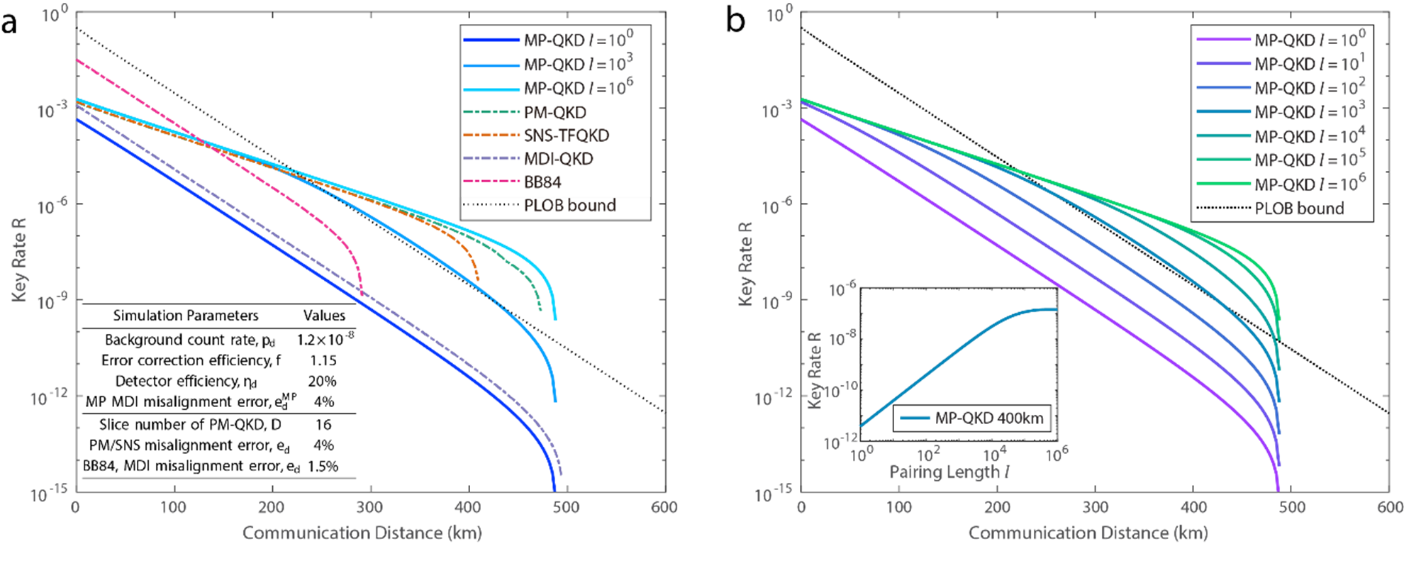 马雄峰研究组提出了一种新型的模式配对协议,同时兼顾单模协议的高性能和双模协议的实用性。如图1d所示,这个协议中,Alice(以及Bob)首先将信号编码在单个光学模式中。然后,根据Charlie的探测响应结果,Alice和Bob对发送的信号进行配对,提取相对的编码信息。由于Charlie只需进行单次干涉即可关联Alice和Bob的信号,该协议获得了与单模协议相近的高成码率。另一方面,由于成码信息编码在配对的信号的相对信息中,模式配对协议的编码可以容忍更高的光源及链路相位变化,因而不需要复杂的远距离激光相位锁定技术,大幅降低单模协议对光源与链路相位控制的要求。图2展示了模式配对协议的成码率。根据实验中激光器、信道的自身稳定情况,可以调节协议中允许的最大配对间隔l。在l>1000时,协议的成码率可以突破点对点协议的线性成码上限;在l取到10^4以上时,协议的成码率和目前的单模协议成码率基本相同。实验验证表明,在没有激光相位锁定的环境下,配对长度l=10^4时,协议仍然有较低的错误率。