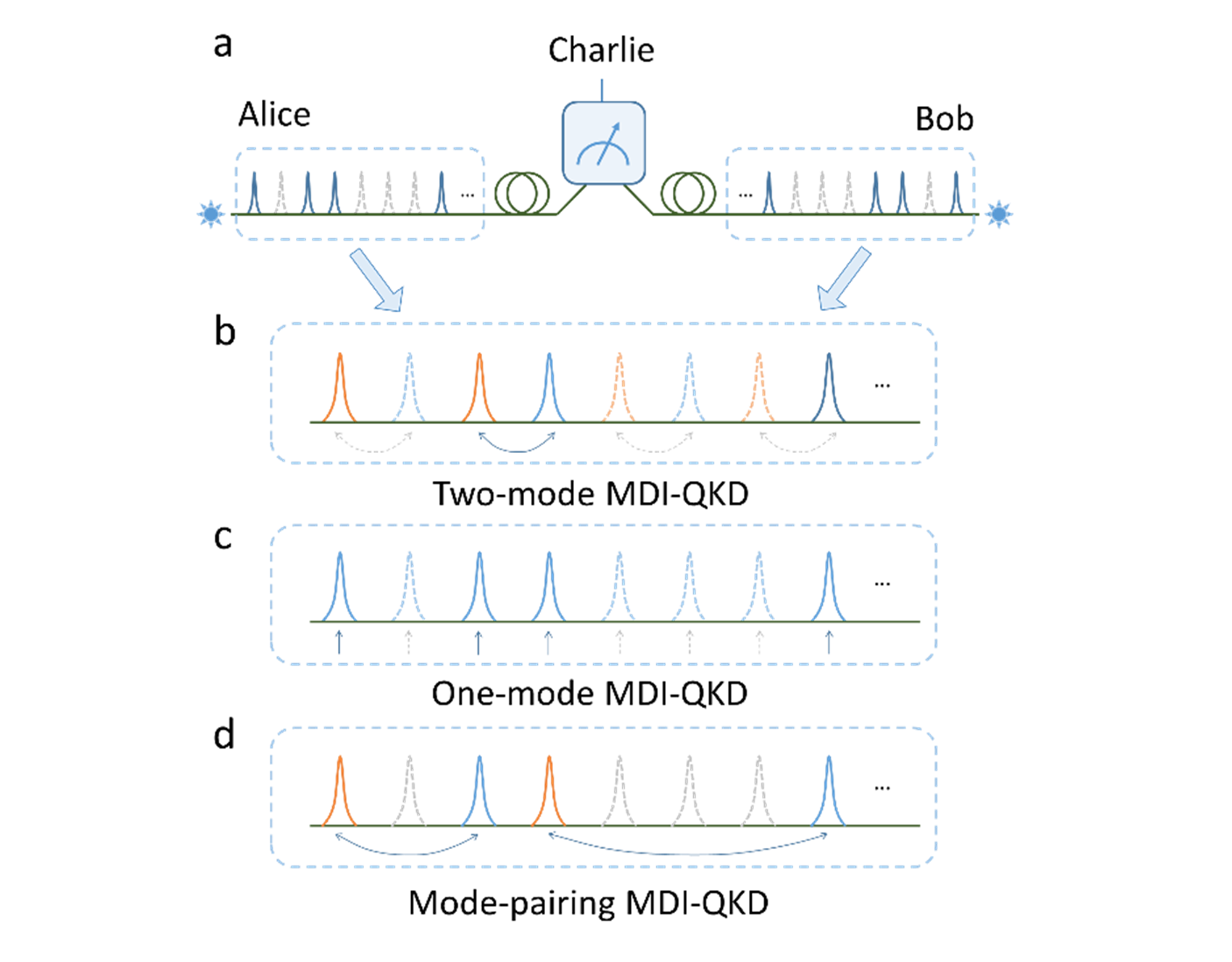 图 1 不同测量设备无关协议(双模协议,单模协议和模式配对协议)的比较
