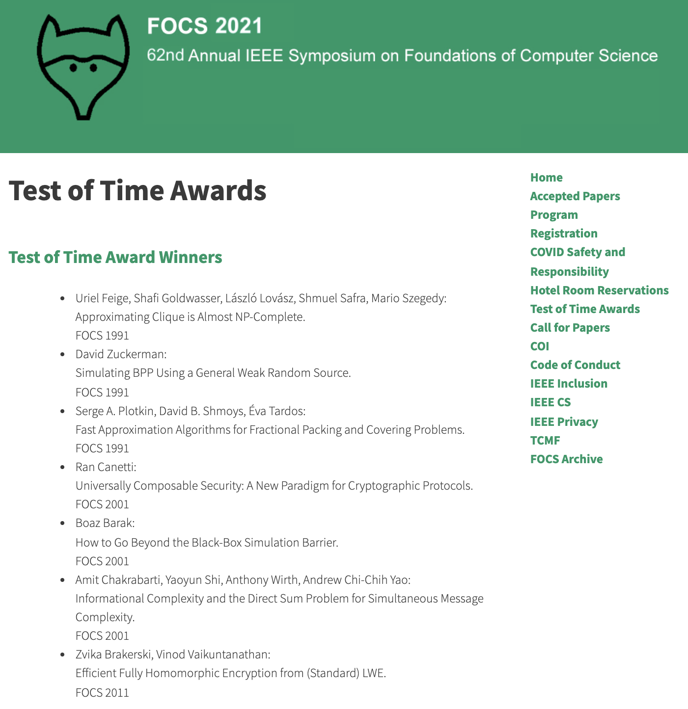 点击链接,查看官方新闻: https://focs2021.cs.colorado.edu/test-of-time-awards/