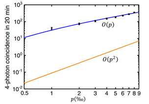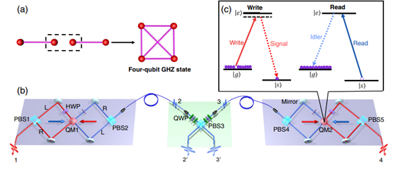 图态是一类重要的多体纠缠态,因其广泛的应用前景而不断受到研究人员的关注,包括测试量子力学基本概念,量子计算,量子密码学和量子计量学等。之前的实验制备图态,特别是线性光学系统中的Greenberger-Horne-Zeilinger (GHZ)态,其制备效率随系统规模呈现指数衰减定律,这限制了其在大规模量子网络中的应用。为了克服非局域图态制备的可扩展性问题,段路明教授等人提出了一套高效制备图态的理论方案(Phys. Rev. Lett. 97,143601(2006)),制备效率随系统规模呈现多项式衰减。该方案的核心思想是,不参与后期操作的光子可以被提前测量和后选择;然后利用长寿命量子存储器以分治的方法生成大规模图态。然而由于实验技术方面存在的困难,该方案此前未能实现。