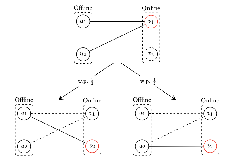 在线随机匹配问题是为了研究互联网显示广告,由Feldman, Mehta, Mirrokni, and Muthukrishnan (FOCS 2009)提出的。在独立同分布的在线随机二分图匹配问题中,一侧节点是固定的离线节点,另一侧是在线到达的节点。该研究把每个在线节点的连边情况叫做它的类别。在开始之前,算法知道所有的离线节点,以及每个在线到达的节点类别的分布(所有在线节点满足独立同分布)。对于每个在线的到达的节点,算法在它到达时刻会知道它的类别,并且必须不可反悔的决定它如何匹配。在离线节点带权的情况中,想要让被匹配的离线点期望权值和最大。在研究中,把这个模型推广到了离线节点带权、并且在线节点不同分布的情况。文章对同分布和不同分布的情况分别设计了竞争比为 0.718 和 0.731 的分数匹配算法,通过用 Gao et al. (FOCS 2021) 提出的在线相关选择,该研究可以把它们取整成为竞争比分别为 0.666 和 0.704 的整数匹配算法。