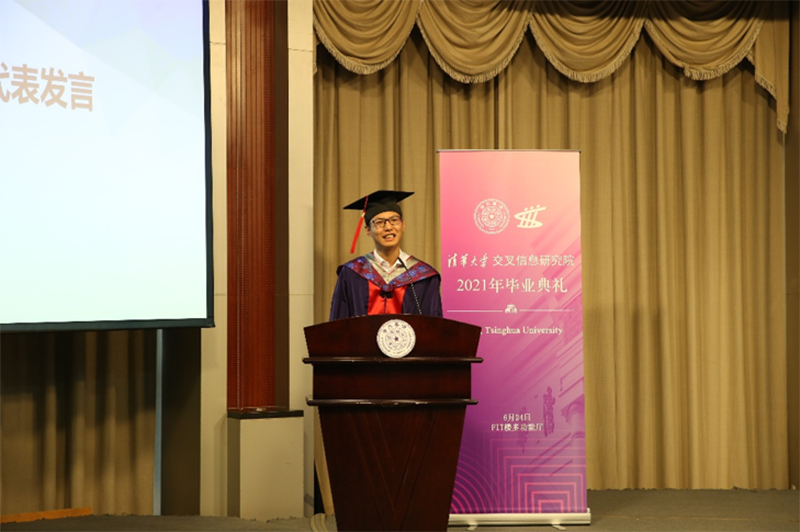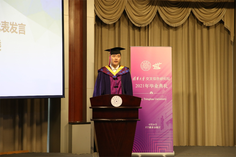 计科70班迟舒乘代表本科毕业生发言。作为姚班的学生,他表示同学们站在新时代变迁的前沿,立在科技创新的风口,机遇与风险并存。作为清华大学培养的科技人才,同学们一定要抓住新时代的脉搏并直面挑战,去完成国家交给我们的重托,加倍努力,在不远的将来,完成时代变革和百年之大变局中的祖国复兴大业。
