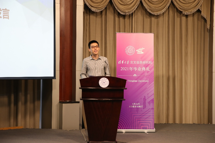 交叉研16班博士张天翼代表计算机方向研究生毕业生发言。他朴实地阐述了自己的科研路程,在迷茫中成长,在困惑中前行,敢于面对失败,敢于重新再来,笃定踏实地将科研之路走下去。张天翼还分享了他作为带班辅导员的种种经历,同时表达了对老师以及交叉信息院的感谢和祝福。