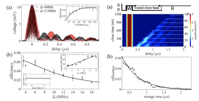 在此项工作中,研究人员将超导量子干涉器(SQUID)作为可控电感嵌入共平面波导谐振腔构建出可快速调频的微波谐振器,并以目标频率对应半波长作为间距将多个调频谐振器等间隔耦合在宽频传输线波导上形成阵列,通过对每个超导量子干涉器磁通量的精确调控,实现了一个可快速收展的频率梳结构。通过对频率梳在不同阶段的动态调频,实现了对带宽10MHz~55MHz的单光子水平弱相干态微波光子的可控存入和读取。此外,基于频率梳的存储过程具有很高的相位保真度并且可同时存储多个模式的脉冲光子,研究人员进而实现了对一个时分编码飞行量子比特的按需存取。此器件结构类似一个原子频率梳,将谐振腔作为人工原子提供了更多的设计和调控自由度,并且能够兼容超导量子计算芯片工艺和结构,易于集成,对于发展含存储模块的超导量子计算系统有重要价值。