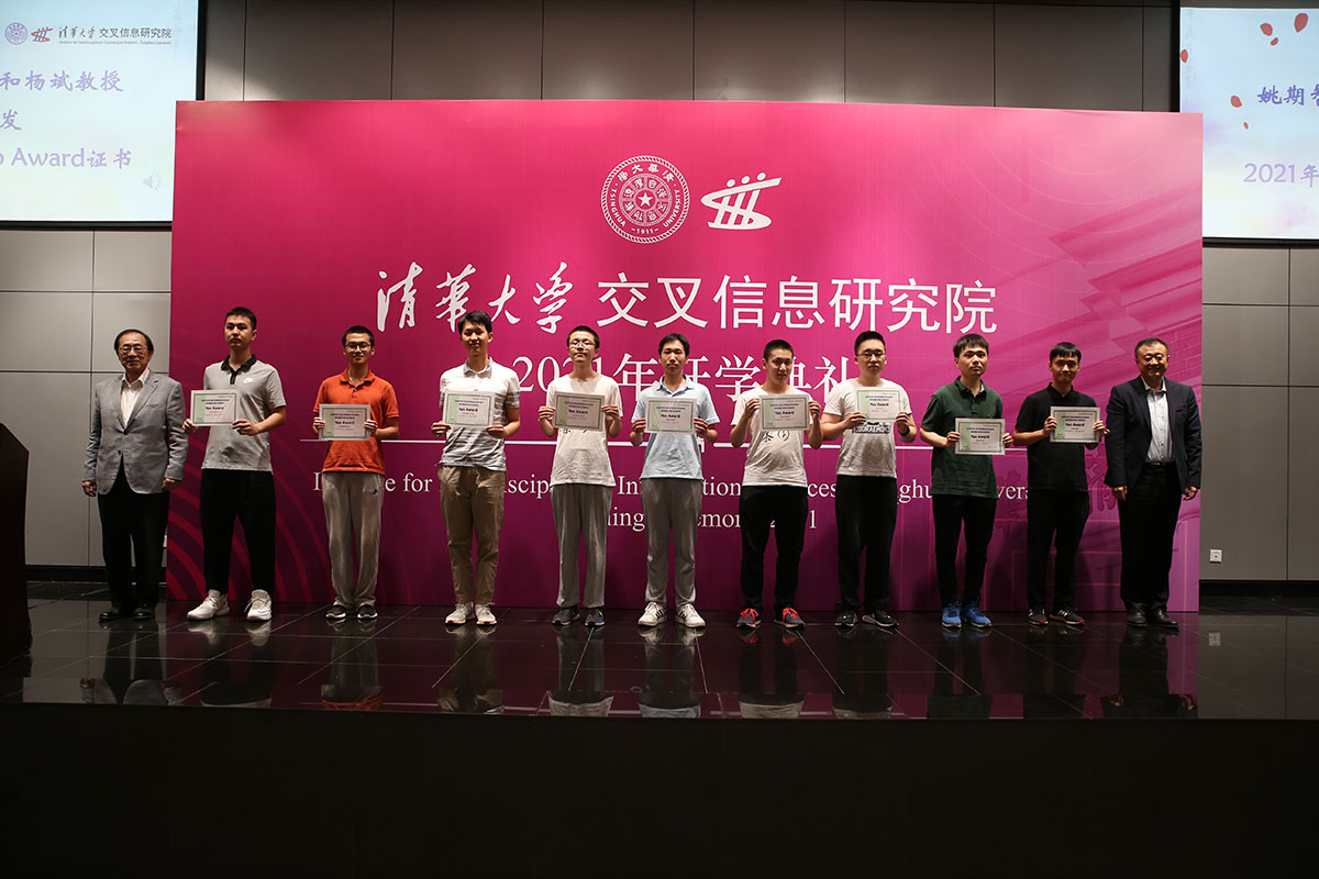 典礼上,姚期智院士和杨斌教授共同颁发了2021年度Yao Award奖学金。本年度共有12名本科生获得这项荣誉。获奖代表计科81班武弘勋同学分享了院内的高质量课程、优秀师资以及科研环境对自己的巨大帮助;他鼓励新生们充分利用交叉信息院积极讨论的氛围,像学长一样勇敢面对困难,在交叉信息院找到自己的目标,做出有影响力的工作。