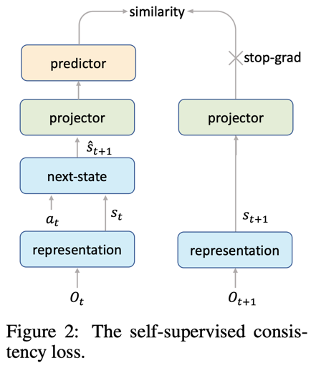 EfficientZero是一种model-based的算法,基于此前的MuZero模型,这类模型一方面通过收集的数据来学习环境模型,从而能够预测环境的变化,另一方面利用所学出的模型预测未来的轨迹和所得回报,通过MCTS进行规划,从而在少量训练数据情况下能够达到较高的性能。EfficientZero提出了三点改进:时序一致性,预测阶段回报,修正目标价值。其中时序一致性的实现是通过计算机视觉领域中的对比学习算法SimSiam实现的,这使得状态转移模型所预测的下一步状态靠近真实轨迹的下一步状态,从而促进状态转移模型的学习。