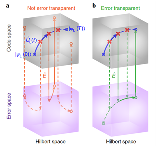 图2:错误透明的相位门操作过程中随机发生的错误可以在其完成之后通过量子纠错来纠正, 其相干性能的表现比普通相位门有明显的提升,展示了很好的容错性。