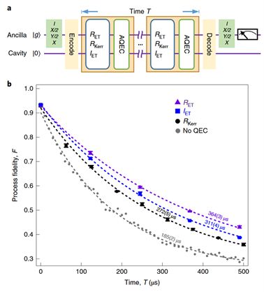 实验样品由一个超导量子比特,一个快速读取腔和一个高寿命存储腔构成,而逻辑比特是对存储腔中的光子态进行二项式编码构成。错误透明的门操作要求逻辑比特在编码空间和错误空间的演化完全一致。为此,研究组在实验中发展了一种新的量子比特驱动技术,称之为“PASS”(Photon-number-resolved AC-Stark Shift)。由于超导量子比特与存储腔有着极强的色散耦合,超导比特的本征频率会随着存储腔内的光子数的变化而变化。因此,在接近超导比特本征频率的频域范围内施加非共振驱动,就能诱导出存储腔内各个光子数态可控的频率偏移。通过设计这种频率偏移,逻辑比特在编码空间和错误空间可以进行完全相同的相位门演化,从而可以实现错误透明的相位门。实验显示,在发生错误的情况下,错误透明的相位门的表现确实比普通的相位门有显著的提升;而且在连续纠错的情况下,逻辑比特在错误透明的相位门操作下比普通相位门有更加优异的相干寿命,展示了该相位门的容错性。