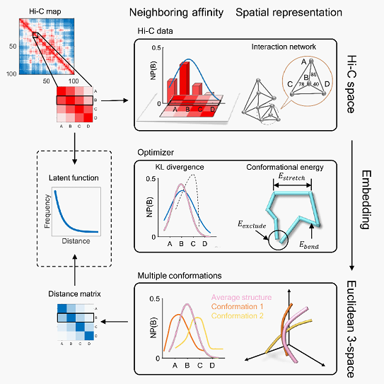 基因组在细胞核中以复杂的三维空间构象的形式存在,这种三维构象随着细胞状态和时间不断地发生动态变化,通常反映了基因组中不同区域发生相互作用的情况。三维基因组结构蕴含着非常丰富的信息,与细胞内绝大多数生物过程相关联,例如基因的转录、染色体的可接近性、DNA的甲基化以及表观遗传具有密切的关系,甚至有研究发现不同的基因组三维构象在疾病中作用也大不相同。因此,解析基因组的三维结构对研究基因调控有着重要意义。近年来,基于高通量测序技术(例如Hi-C)的三维基因组建模方法得到了广泛研究,然而大部分方法都依赖于对基因相互作用频率与染色体空间距离之间的关系进行假设。