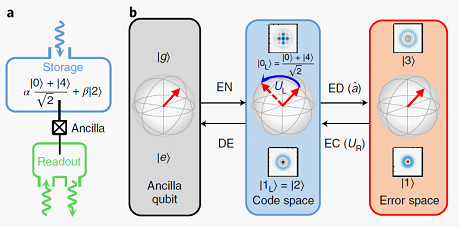 在一般的量子纠错方案中,每个逻辑量子比特由很多个物理比特组成,通过冗余的自由度实现纠错。然而,随着物理比特数目的增加而系统可能发生的错误通道也会增多,同时多物理比特编码的操作需要物理比特之间非局域的相互作用,因此实验上量子纠错和逻辑比特的量子门都很难实现。为了克服这些问题,孙麓岩研究组采用了一种基于单个微波谐振子的物理架构,首次在实验上证明了二项式量子纠错码和在纠错保护下的量子门操控。在该方案中,单个微波谐振子的无限大希尔伯特空间提供了有效的冗余自由度来实现量子信息编码,而错误通道的数目保持不变(主要为微波光子的丢失),因此对硬件的要求大大简化,具有非常强的可操作性。