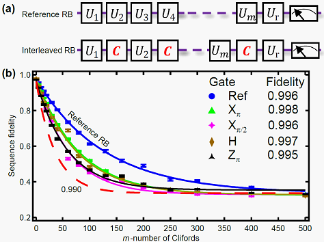 图1 单比特和乐门的RB结果。(a)参照和插入RB实验门序列。