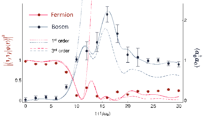 此项工作实验演示了如何在囚禁离子系统中模拟量子场论中的现象,比如粒子的产生和湮灭以及自相互作用过程等。该实验实现了原理验证性的量子模拟实验,演示了以波色模式为媒介的费米子——反费米子散射过程。实验利用离子振动模式来编码模拟的波色模式,同时将费米模式的状态映射到离子的4个电子能级中。这是首个利用离子的不同自由度同时模拟波色子和费米子的实验。此外,与标准的经典或量子计算途径不同,该实验的方法不局限于微扰区域,而是可以观测到深入非微扰区域的精确动力学。即使对于拥有许多量子比特的量子计算机来说,这样的计算也是十分困难的。该实验打开了通向量子场论的可扩展数字——模拟混合量子模拟的大门。