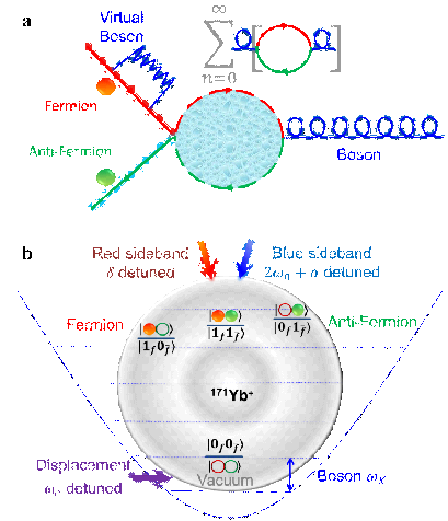 图 1:费米子——反费米子散射过程和该过程与囚禁镱离子系统的映射关系。(a) 费米子、反费米子和波色子之间相互作用的费曼图。(b) 在囚禁镱离子系统中实现该相互作用的哈密顿量涉及的编码和操作。