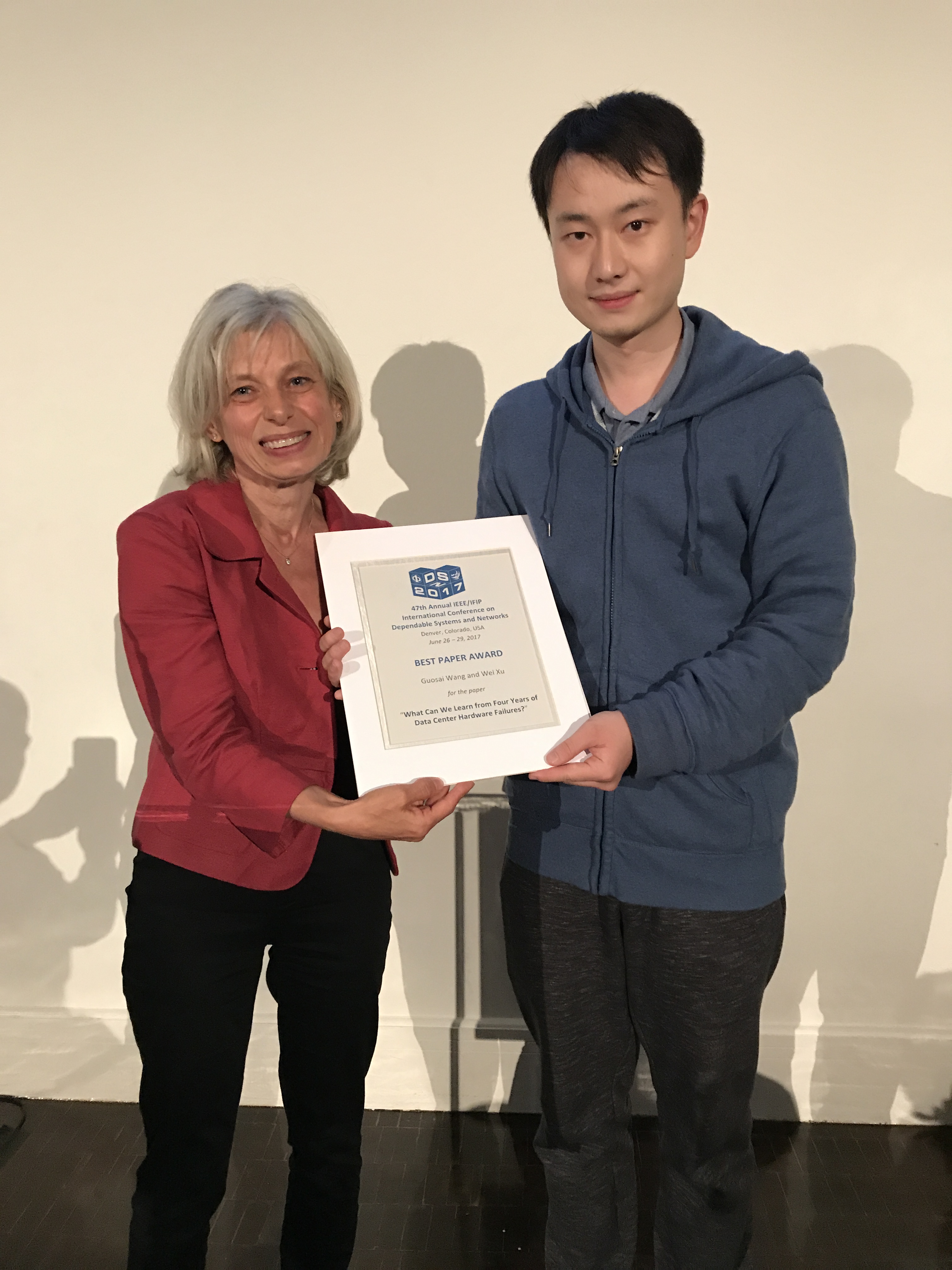 2017可靠系统和网络国际会议(DSN 2017)6月26至29日在美国丹佛市召开。交叉信息院徐葳助理教授研究组的研究论文《分析四年的数据中心硬件故障日志,我们学到了什么?》(What Can We Learn from Four Years of Data Center Hardware Failures?)获得最佳论文奖,是国内单位历史上首次获得此项奖励。论文第一作者、交叉信息院2014级博士研究生王国赛在大会全体会议上做了口头报告。