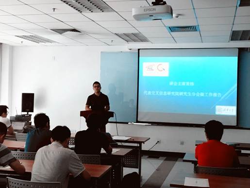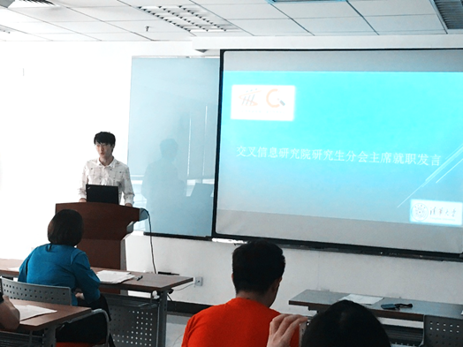 首先,由交叉信息院第四届研分会主席常炜代表上一届研分会做工作报告。他在会上细数了在2015和2016两年期间我院研分会的特色活动,包括一二九大合唱、良师益友评选、博士生论坛等,同时为改善院内研究生生活做了很多贡献。