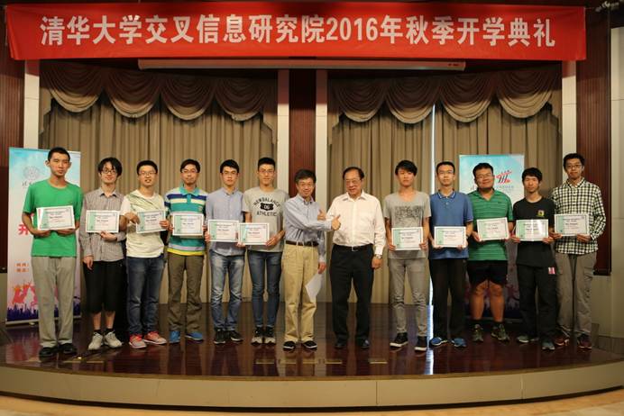开学典礼上,史宗恺老师和姚期智院长共同颁发了本年度的Yao Award奖学金,共有12名同学获颁证书:范浩强、占玮、陈立杰、董方宏、李志远、刘壮、李晨星、胡渊鸣、孙天成、王若松、彭天翼、罗雨屏。范浩强作为获奖代表分享了在姚班学习、科研的心得,特别介绍了姚课的特色与魅力。