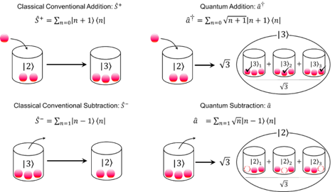 图1:经典算术与量子算术的基本差异。经典算术当中,我们可以确定性地加、减一个粒子,但在量子力学中,加、减一个粒子的概率依赖于已经存在的个数,使其成为概率性操作.