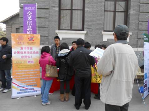 (通讯员 张燕)4月20日上午,2013年“清华大学校园开放日暨招生信息交流会”在大礼堂和清华学堂周边拉开帷幕。来自交叉信息院招生工作组的老师和计算机科学实验班(姚班)大四年级的优秀学生共同组成招生咨询小组,与众多考生和家长进行了面对面交流,一如既往吸引了广泛关注。