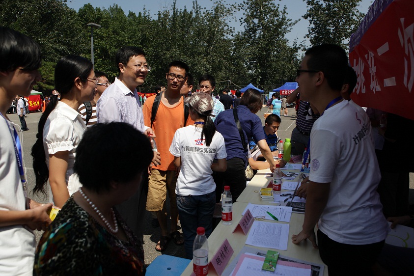 在8月15日一早,交叉信息院已录取新生报到暨2012年姚班二次招生工作即拉开了序幕,新同学们怀着饱满的热情踏入了清华园的大门。上午10点,校长陈吉宁和校党委书记胡和平等校领导亲赴新生入学报到地点,看望前来报到的新生和家长们,并慰问参与迎新工作的师生员工。在综合体育馆西侧网球场,陈吉宁校长亲切向新同学询问报到情况和体育锻炼情况,当得知我院2012级的张天翼等许多同学都是独自来到学校报到,陈校长非常高兴,他鼓励同学们要继续培养独立生活的能力,进而培养独立思考的人格。在紫荆学生公寓区,胡和平书记来到我院姚班二次招生分报名点询问招生和迎新情况,翻阅姚班招生宣传材料,并和学生志愿者亲切交谈。